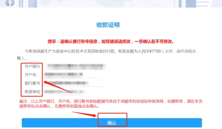 项目负责人点击确认“确认收款证明”链接,核实《收款证明》中本单位的“开户银行”“开户名”“银行账号”“收款单位”等信息无误后点击“确认”(如图1所示),再点击“PDF纸质材料下载地址”(如图2所示),形成带水印的电子版《收款证明》(如图3所示),下载打印《收款证明》后加盖单位公章及财务章。