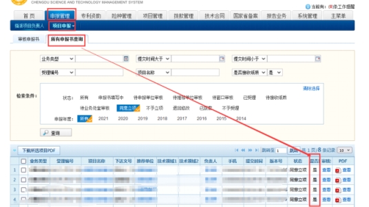 (四)受理结果在线查询确认 项目负责人可通过管理系统在线查询确认纸件材料办理结果:市政务服务中心科技局窗口未确认收到纸件材料前,对应项目申报书在管理系统中“是否接收纸质”状态为“否”(如图9所示);市政务服务中心科技局窗口收到纸件材料后,在管理系统确认收件,管理系统自动将对应项目“是否接收纸质”状态修改为“是”(如图10所示)。