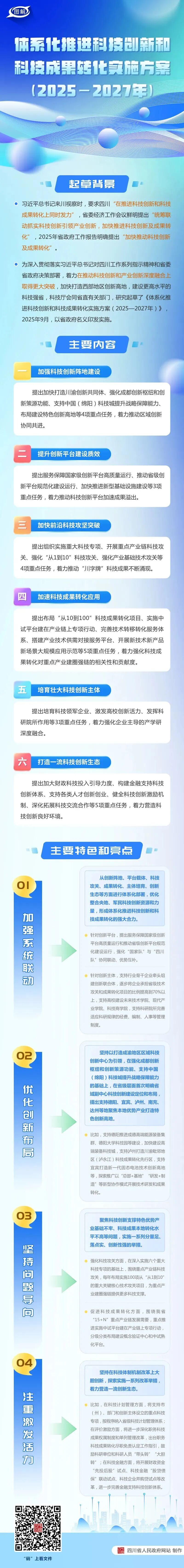 近日,四川省人民政府正式印发《体系化推进科技创新和科技成果转化实施方案(2025—2027年)》(以下简称《方案》),旨在通过一系列重点任务与举措,体系化推进科技创新和科技成果转化,引领支撑重点产业建圈强链,加快培育和发展新质生产力,着力打造西部地区创新高地、建设更高水平科技强省。